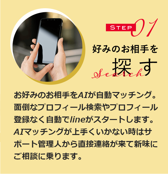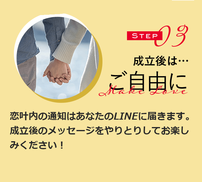 ご利用メンバーは20代、30代、40代以上と幅広い年代の方にご利用頂いており、あなたのLINE(ご利用中のLINEで利用可能!)に通知が届くので出会いのチャンスを見逃しません。